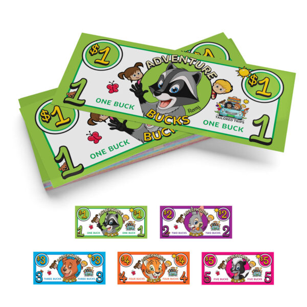 Adventure Bucks set includes: (10) $1 Bucks, (10) $2 Bucks, (5) $3 Bucks, (5) $4 Bucks, and (5) $5 Bucks!