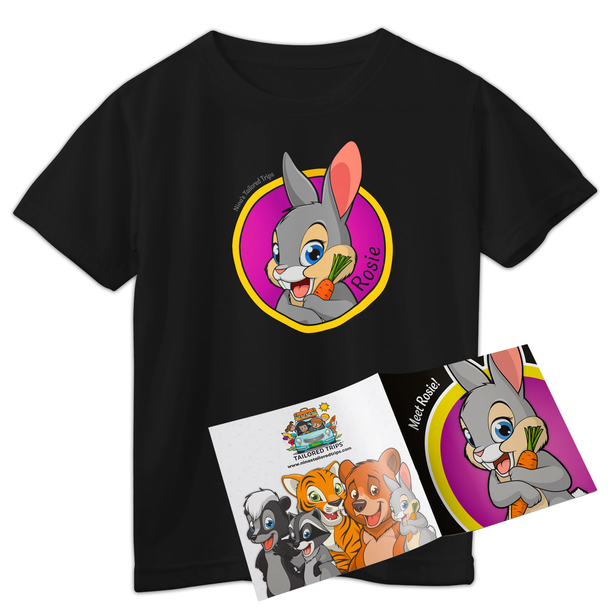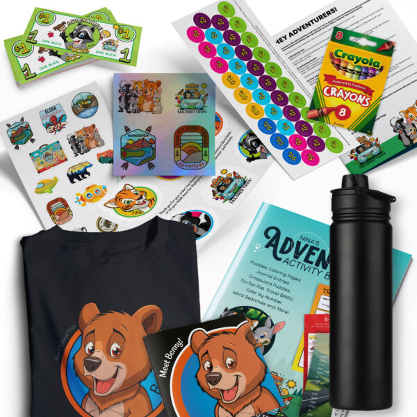 The Voyager Kit is the ultimate experience for young adventurers, packed with everything needed to make every journey unforgettable. It includes all the essentials from the Explorer and Adventurer Kits—like the Adventure Activity Workbook Vol. 1, Crayola Crayons, Adventure Bucks, intro brochure, character and price label sheets, and a water bottle with its own sticker sheet. But it doesn’t stop there! The Voyager Kit also features an exclusive Nina’s T-shirt, a Character Bio Booklet to bring each Adventure Buck friend to life, and a dazzling holographic sticker sheet for extra fun. It’s the perfect all-in-one bundle for kids who want to dive deeper into the world of Nina’s Tailored Trips.